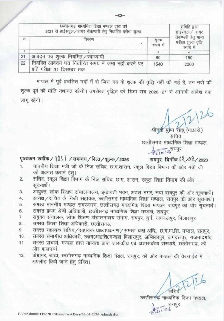 रायपुर | 12 फरवरी, 2026 छत्तीसगढ़ माध्यमिक शिक्षा मंडल (माशिमं) ने शैक्षणिक सत्र 2026-27 से बोर्ड परीक्षाओं के शुल्क ढांचे में बड़ा बदलाव किया है। लंबे समय से फीस न बढ़ाए जाने का तर्क देते हुए मंडल ने विभिन्न मदों में लगभग 70 से 80 प्रतिशत तक की वृद्धि कर दी है। अब नियमित परीक्षार्थियों को परीक्षा शुल्क, अंकसूची और प्रैक्टिकल शुल्क मिलाकर 800 रुपये देने होंगे, जो पहले मात्र 460 रुपये थे।