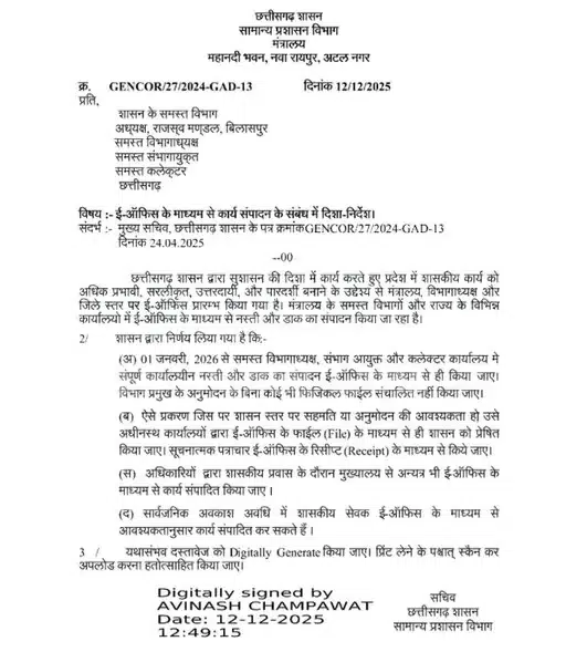 Chhattisgarh Digital Administration : रायपुर, 13 दिसंबर 2025। छत्तीसगढ़ सरकार ने प्रशासनिक सुधार की दिशा में एक ऐतिहासिक कदम उठाते हुए राज्य में पूरी तरह डिजिटल प्रशासन लागू करने का निर्णय लिया है। सरकार ने स्पष्ट कर दिया है कि 31 दिसंबर 2025 के बाद फिजिकल फाइल और नोटशीट प्रणाली पूरी तरह बंद कर दी जाएगी। इसके स्थान पर 1 जनवरी 2026 से सभी शासकीय कार्यालयों में केवल ई-ऑफिस सिस्टम के माध्यम से ही काम किया जाएगा।