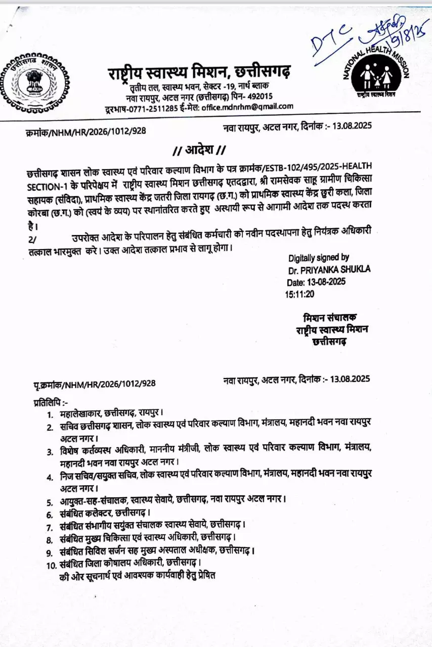 रायगढ़। जिले के स्वास्थ्य विभाग में पदस्थ एक NHM संविदा स्वास्थ्य कर्मी द्वारा फर्जी ट्रांसफर आदेश बनवाकर खुद का ट्रांसफर कर लेने का मामला सामने आया है। विभाग के बड़े अधिकारियों ने आदेश की पुष्टि किए बिना ही उसे कार्यमुक्त कर दिया, जिससे विभाग में हड़कंप मच गया।