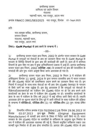 Gem Portal रायपुर। छत्तीसगढ़ सरकार ने शासकीय खरीदी प्रक्रिया में पारदर्शिता और अनुशासन सुनिश्चित करने के लिए बड़ा कदम उठाया है। राज्य सरकार ने सभी विभागों को आदेश जारी किया है कि अब सभी वस्तुओं और सेवाओं की खरीदी जेम (GeM) पोर्टल के माध्यम से ही की जाए।