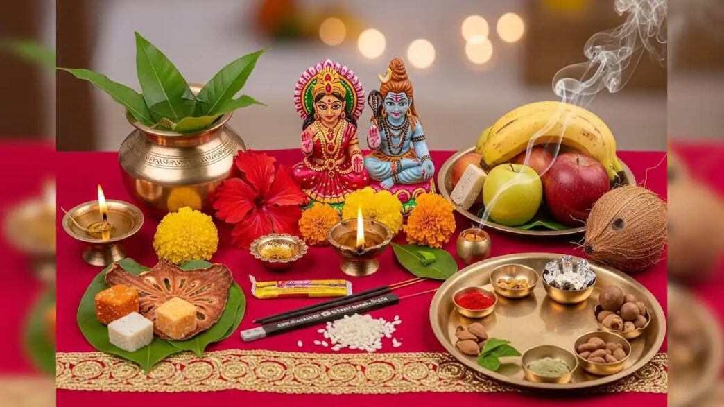 - सजावट और अन्य सामग्री- मंडप बनाने के लिए केले के पत्ते, फूलों की माला और फूल, पान के पत्ते और सुपारी, कच्चा सूत, कच्ची हल्दी की गांठें, गेहूं या चावल, एक चौकी या आसन जिस पर पूजा की सामग्री रखी जाएगी।