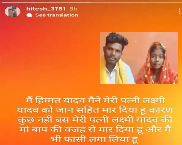स्टेटस में लिखा था: “मैं हिम्मत यादव मैने अपनी पत्नी लक्ष्मी यादव को जान सहित मार दिया हूँ। कारण कुछ नहीं बस मेरे पत्नी लक्ष्मी यादव के मां बाप की वजह से मारा हूँ और मैं खुद भी फांसी लगा कर जान दे रहा हूँ…”
