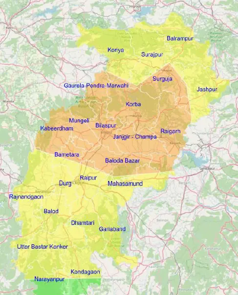 रायपुर, सुकमा, बीजापुर, दक्षिण बस्तर, दंतेवाड़ा, बस्तर, नारायणपुर, कोंडागांव, कांकेर, धमतरी, बालोद, राजनांदगांव, गरियाबंद, महासमुंद, बलौदा बाजार, जांजगीर-चांपा, रायगढ़, बिलासपुर, कोरबा, जशपुर, गौरेला-पेंड्रा-मरवाही, दुर्ग, बेमेतरा, कबीरधाम, मुंगेली, सरगुजा, सूरजपुर, कोरिया और बलरामपुर।